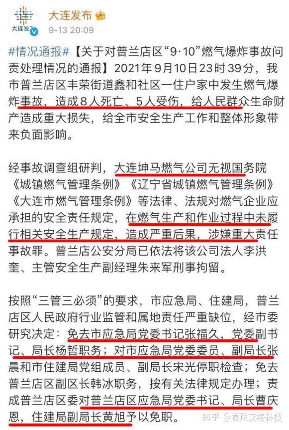 9月10日大連普蘭店區“9·10燃氣爆炸致8死5傷案”,大連應急局黨委書記、局長均被免職。
